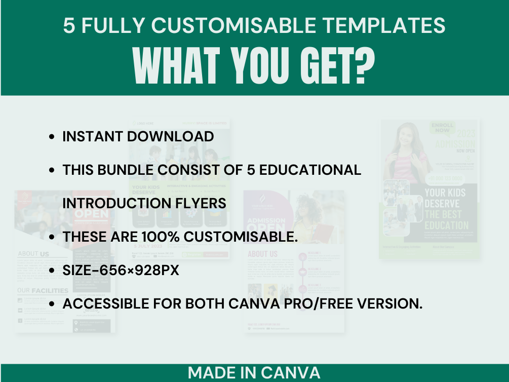 Are you a Coach or school Owner? Then this listing is for you! This bundle consist of 5 unique Education flyer. These templates are easily accessible in Canva free version.
