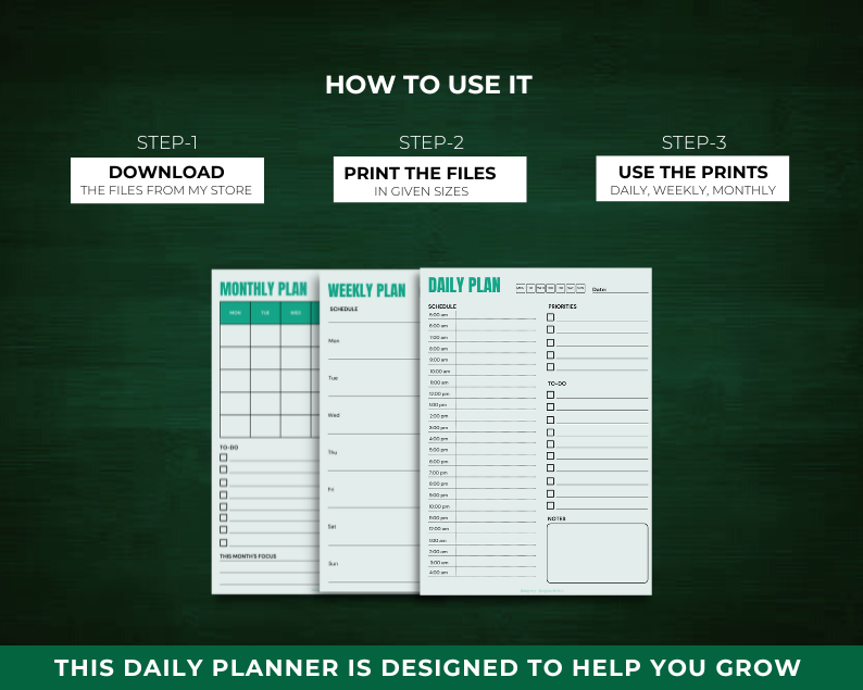 This is a printable daily planner designed and customized to make your daily life easier and to help achieve your goals effectively.
